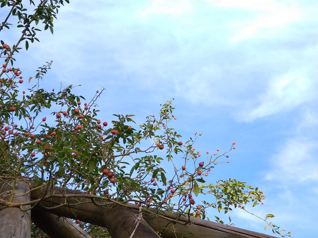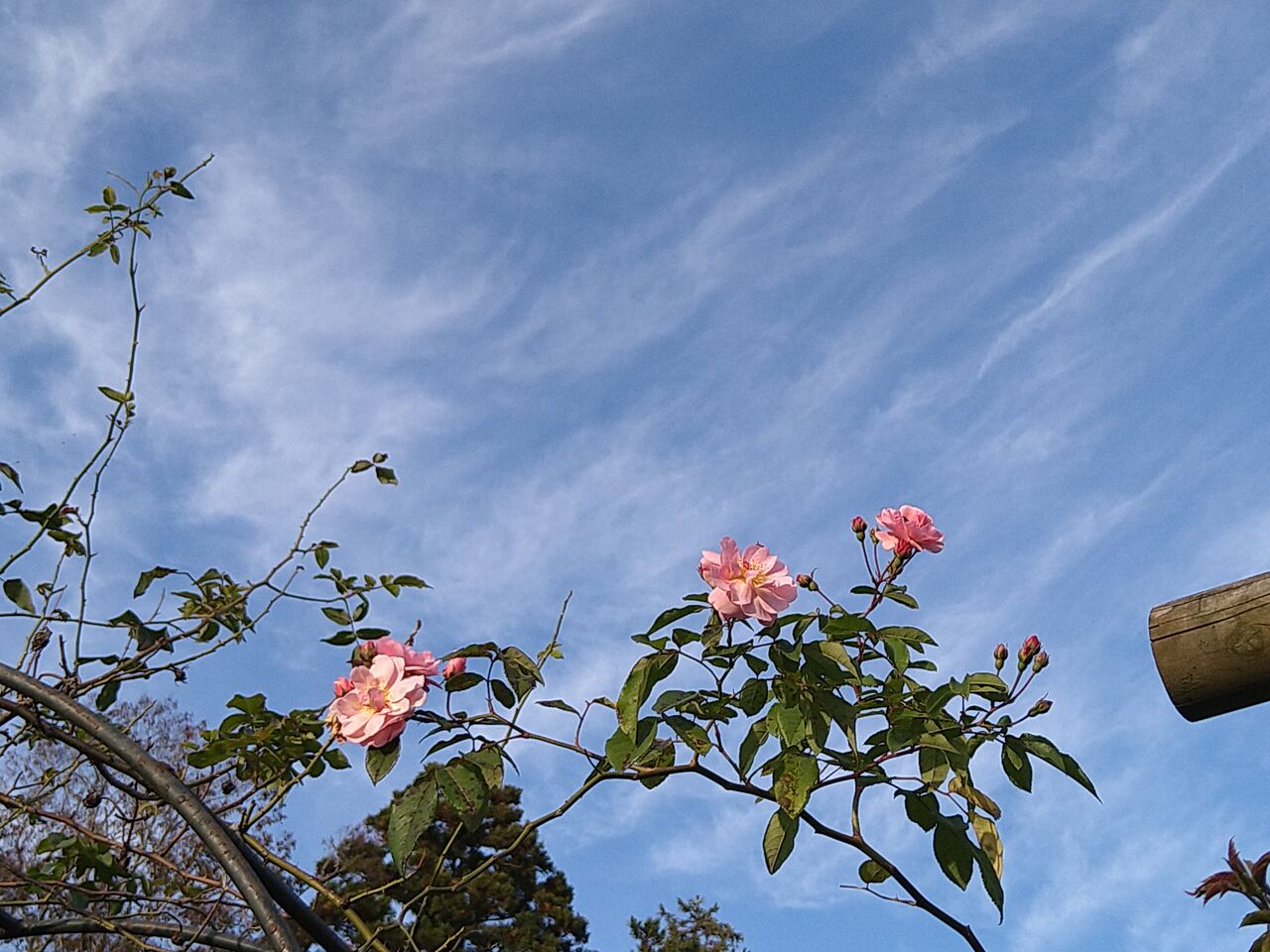 つるバラを撮ろうと見上げてみれば、いい空