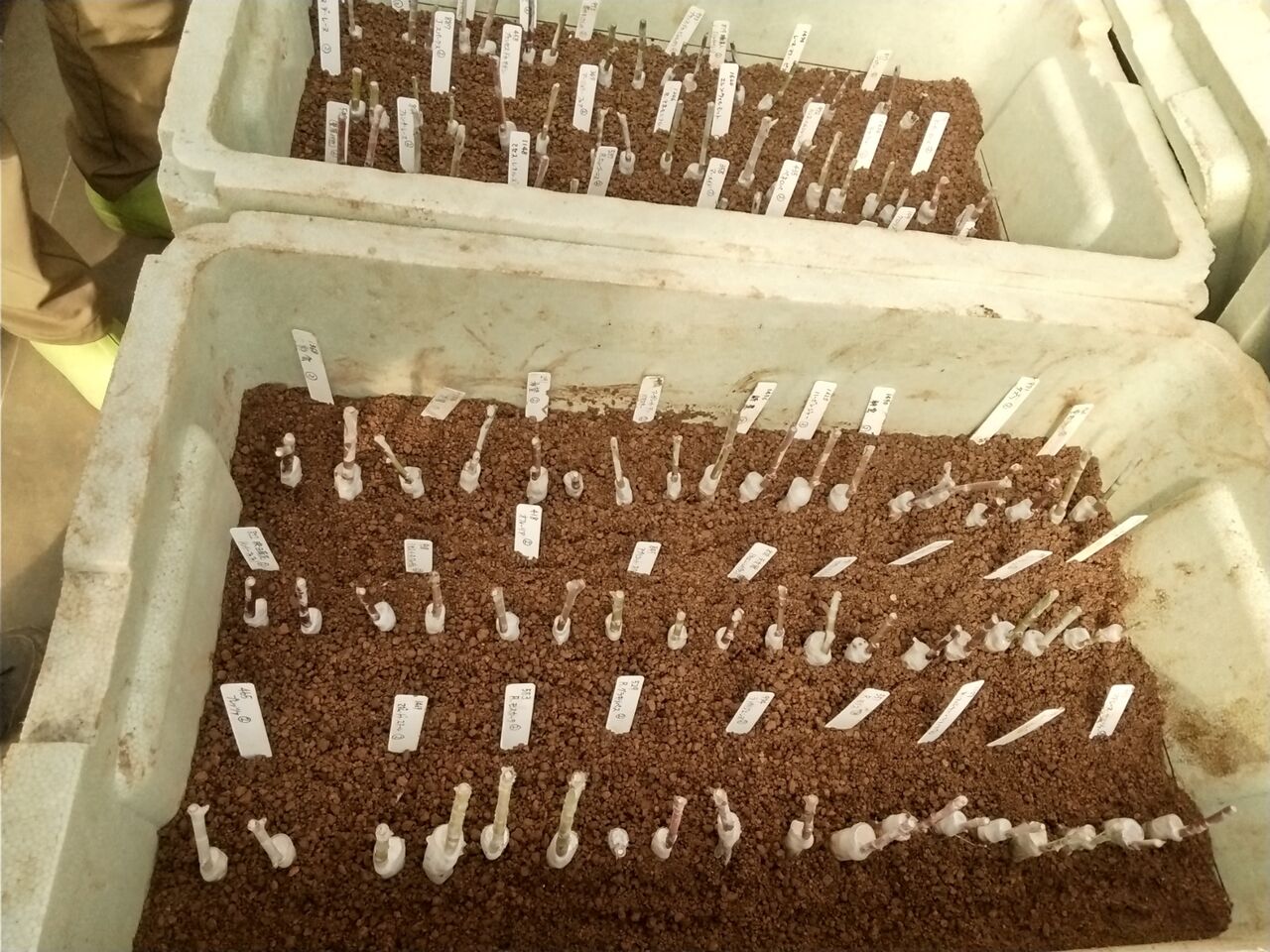 玉手箱を開けたら・・・ 2024年02月14日 21:59 年のはじめのためしとて〜あれからはやひと月・・・ソロソロ玉手箱を〜ジャジャ〜ン!!接ぎ木の途中経過をちょっとだけ開けて見せていただきました〜自分の接ぎ木したのは?枯れてない?芽は?出てる?皆んなドキドキ💗でした~今年のチャレンジ、ポット植えの苗は?まだ芽は少しぷっくりし始めたところです👁もう2週間かな~🌿楽しみも、反省もまだまだ先のようですね。しばらく良い子の成長を待ちましょう玉手箱は直ぐに閉じられました。またね〜 「接ぎ木・挿し木・挿し芽・交配」カテゴリの最新記事 < 前の記事次の記事 >
