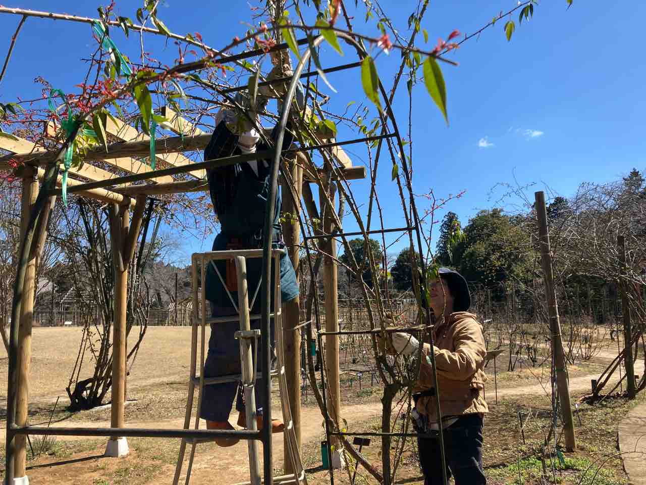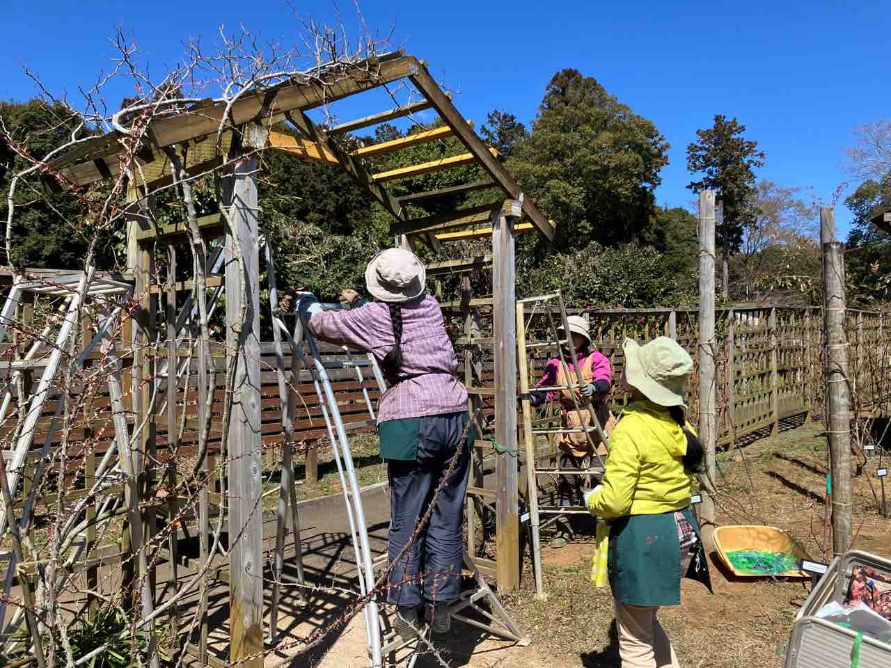 男性チーム 井戸周りのバラの誘引