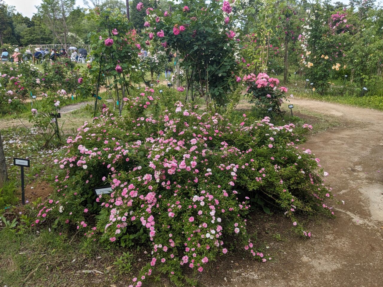 その影響で来園者がとても多かった、そしてキーワードは「杏仁豆腐のバラはどれですか?」こう質問される方や、普段は人が少なめのサンショウバラの周りでも「これよ〜」という声が。