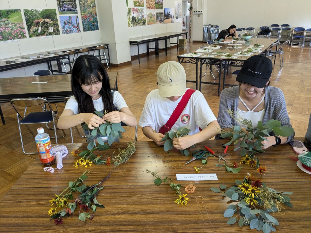 園内で集めたルドベキアや四季咲きミモザの枝などを、会場に飾るだけでなく小さなスワッグにしてプレゼント、そしてついにはスワッグを作るところから体験してもらうことへと進化していきました。これが大好評! みんな喜んでくれてました
