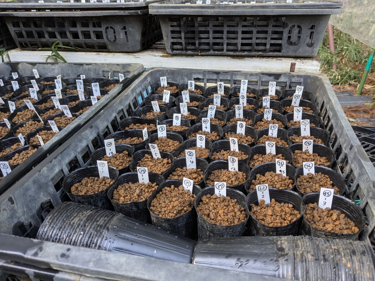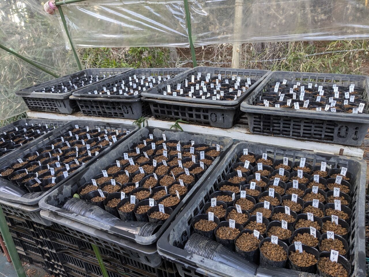 バラの種まき 2025年03月08日 09:30 今日は交配班の集まりでした昨年春に交配をして、秋に種をとり、冬の間土の中で保管していたものを播きました今回の交配では1つの実に10個以上の種が入っているものが多かったです、すでに発芽発根している姿はまるでモヤシのようでした1つのポットにひと粒ずつ、合計326粒さあ!これから毎週「発芽したかなぁ💕」と覗き込むのが楽しみな期間が続きますそしてあと2ヶ月もしたらまた新たな交配作業が始まります!それまでに施肥、残りの誘引や剪定などやる事はたくさんです、来週も頑張りましょう! 「接ぎ木・挿し木・挿し芽・交配」カテゴリの最新記事 < 前の記事次の記事 >