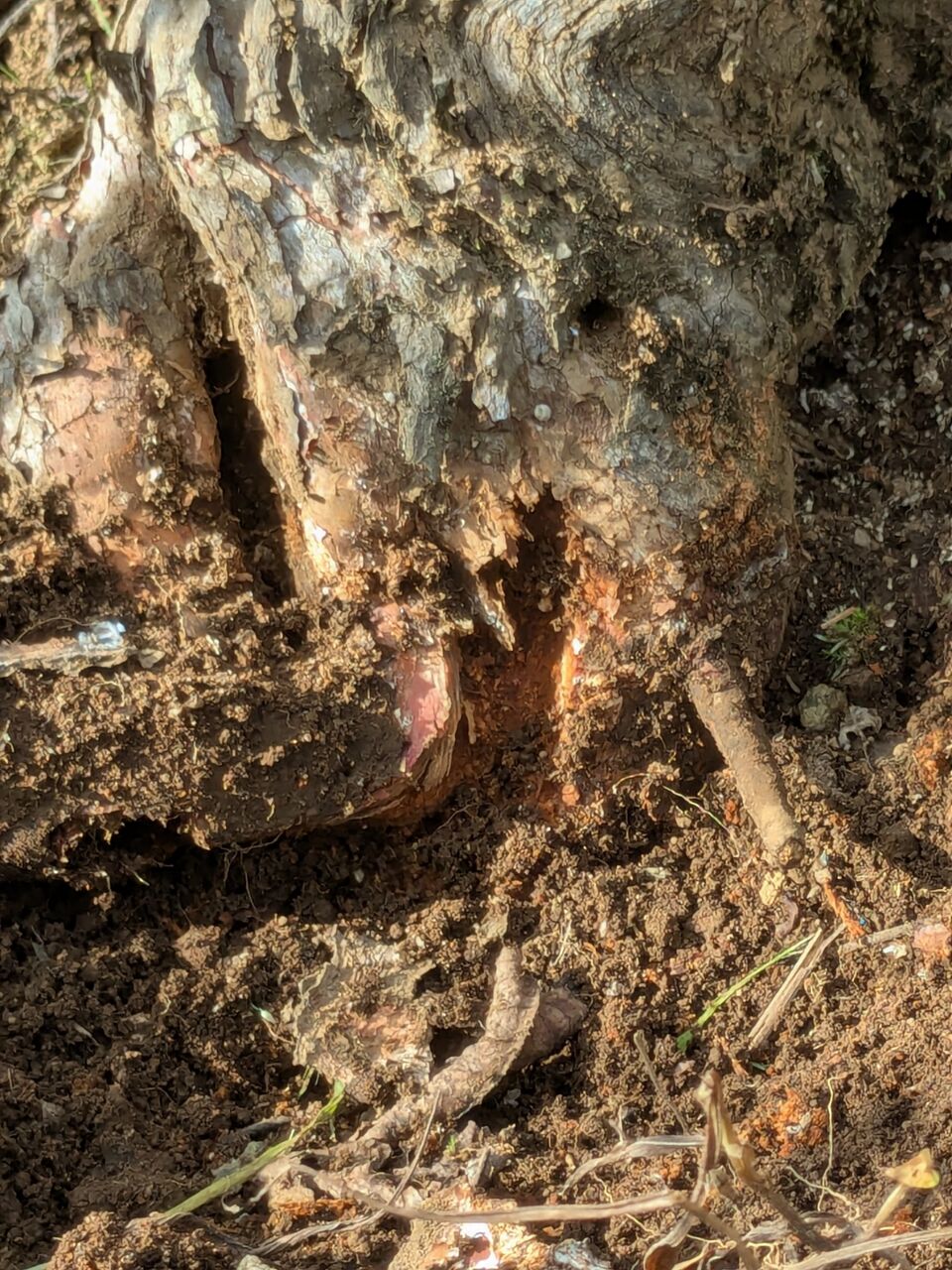 チガヤ、ハマスゲ、スベリヒユ…様々な雑草を取り除くと見えてくるのがカミキリムシの被害です、幼虫は幹の中を食い進むので株元におがくずが出ていたらその証拠です