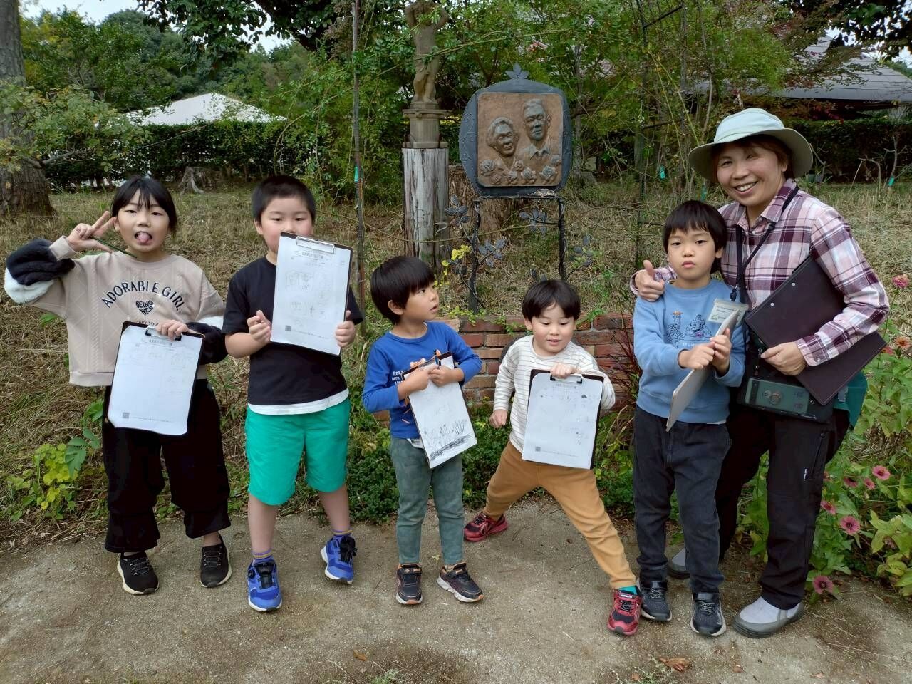 毎回みんなに言うのは「スケッチしたらそのバラの名前を書いておきましょう」です、カタカタの名前が多い中、省三コーナーのバラには漢字が使われている事が多いです。まだ漢字が書けないお子さんが自慢げに見せてくれたのは「ひなまつり」 そう!ひらがなの名前がつけられているバラでした!😊